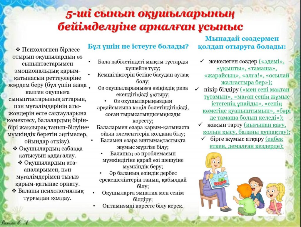 📌 5 сынып оқушыларының бейімделуіне байланысты жүргізілген психологиялық тренинг, ашық әңгімелесу, тест қорытындылары бойынша пән мұғалімдері мен педагог- ұйымдастырушыларына арналған ұсыныс.💐💐💐
