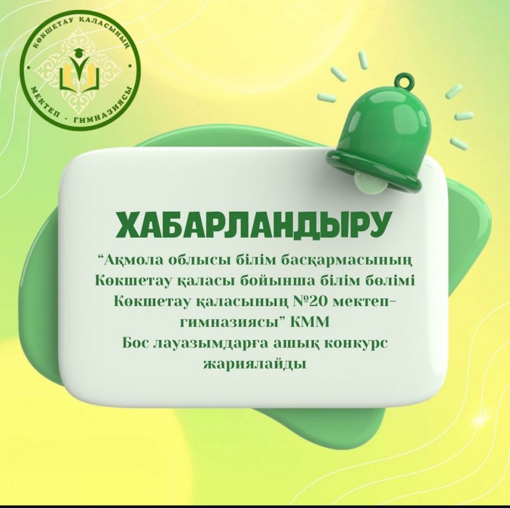 Байқау туралы хабарландыру «Ақмола облысы білім басқармасының Көкшетау қаласы бойынша білім бөлімі Көкшетау қаласының № 20 мектеп- гимназиясы» КММ